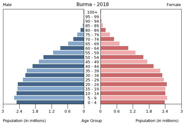 Lexas Länderservice > Bevölkerungspyramiden > Südostasien > Myanmar Responsive Ad Bevölkerungspyramiden Myanmars Bevölkerungspyramiden Siehe auchDie graphische Darstellung der Altersstruktur WeblinksLänderinformationen MyanmarQuellenCIA World Factbook diverse AusgabenBildernachweisPublic domain